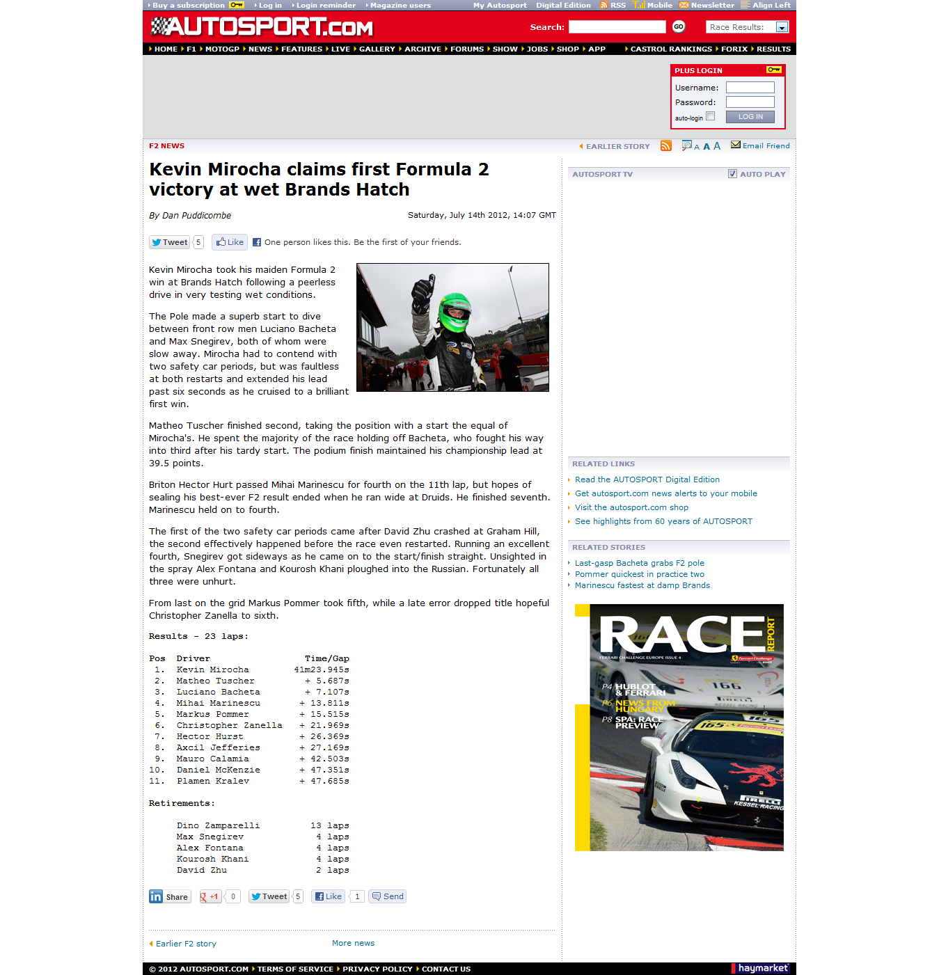 Tym razem coś z teraźniejszości – oczekując powrotu Roberta Kubicy do sportowego ścigania, nie tracimy z pola widzenia jego potencjalnych następców. I tak oto z prawdziwą przyjemnością donosimy, że w wyścigu Formuły 2 rozgrywanym dzisiaj, w trudnych deszczowych warunkach na brytyjskim torze Brands Hatch, swoje pierwsze zwycięstwo odniósł Kevin Mirocha. Polak ruszający do wyścigu z trzeciej pozycji, prowadzenie objął już na starcie i nie oddał go aż do mety, którą przekroczył z prawie 6 sekundową przewagą nad drugim Mateo Tuscherem, liderem mistrzostw. Szkoda tylko, że temat nie istnieje w naszych mediach, dla których ważniejsze jest to, co powiedzieli Piłkarz Który Nie Wyszedł z Grupy i Tenisistka Która Może Dotarła Do Finału Ale Jednak Nie Wygrała…