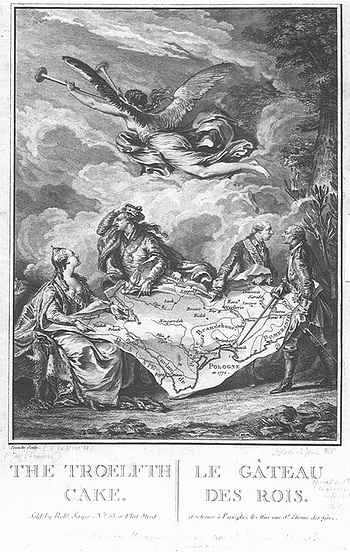 Kołacz królewski – alegoria rozbioru Polski, miedzioryt wykonany na podstawie rysunku przez Nicolasa Noël Le Mire. Wikimedia Commons – repozytorium wolnych zasobów. Znam ten obraz odkąd tylko patrzyłem ze zrozumieniem – oryginalny miedzioryt wisiał na ścianie w pokoju rodziców.
