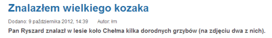 Szczęście to czy pech? lehardi Werble i trąby 9 października 2012 1 Minute Wielki Kozak Drugi Wielki Kozak Źródło: dziennikwschodni.pl Udostępnij: Kliknij, aby udostępnić na X (Otwiera się w nowym oknie) X Kliknij, aby udostępnić na Facebooku (Otwiera się w nowym oknie) Facebook Kliknij by wydrukować (Otwiera się w nowym oknie) Drukuj Kliknij, aby wysłać odnośnik e-mailem do znajomego (Otwiera się w nowym oknie) E-mail Lubię Wczytywanie… Podobne Opublikowane przez lehardi Zobacz wszystkie wpisy, których autorem jest lehardi Opublikowano 9 października 2012