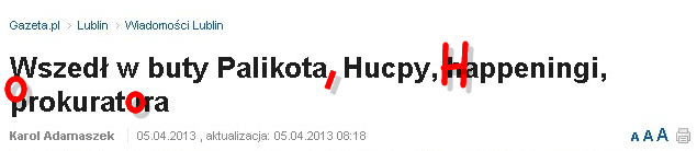 Nie śmierdzą? lehardi Szybkie cięcia w stronę zgięcia 5 kwietnia 20135 kwietnia 2013 1 Minute lublin.gazeta.pl Palikot Palikotem, ale hygiena być musi przecież! P. S. Błędy, błędy, błędy: lublin.gazeta.pl Tym bardziej, na litość boską, hygieny! Udostępnij: Kliknij, aby udostępnić na X (Otwiera się w nowym oknie) X Kliknij, aby udostępnić na Facebooku (Otwiera się w nowym oknie) Facebook Kliknij by wydrukować (Otwiera się w nowym oknie) Drukuj Kliknij, aby wysłać odnośnik e-mailem do znajomego (Otwiera się w nowym oknie) E-mail Lubię Wczytywanie… Podobne Opublikowane przez lehardi Zobacz wszystkie wpisy, których autorem jest lehardi Opublikowano 5 kwietnia 20135 kwietnia 2013