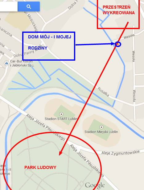 4) cytowany w Kurierze Lubelskim, a zatrudniony w Kancelarii Pana Prezydenta, pan Krzysztof Komorski, powiedział: „Aby koncerty były jak najmniej uciążliwe, głośniki zostaną dodatkowo skierowane w stronę parku Ludowego, jak najdalej od okolicznych mieszkań”. Nie wiem, czy również Pan Prezydent zauważył błąd zawarty w przytoczonym powyżej stwierdzeniu – i nie chodzi tu o błędną pisownię nazwy Parku Ludowego. Otóż skierowanie głośników na Park Ludowy sprawi jednocześnie, że rzeczone głośniki będą skierowane nie tylko na Park Ludowy, ale przed wszystkim na dom mój – i mojej rodziny – jako że znajduje się on na drodze dźwięku biegnącego z „przestrzeni wykreowanej” ku Parkowi Ludowemu. Opisaną sytuację obrazuje poniższy szkic sytuacyjny: