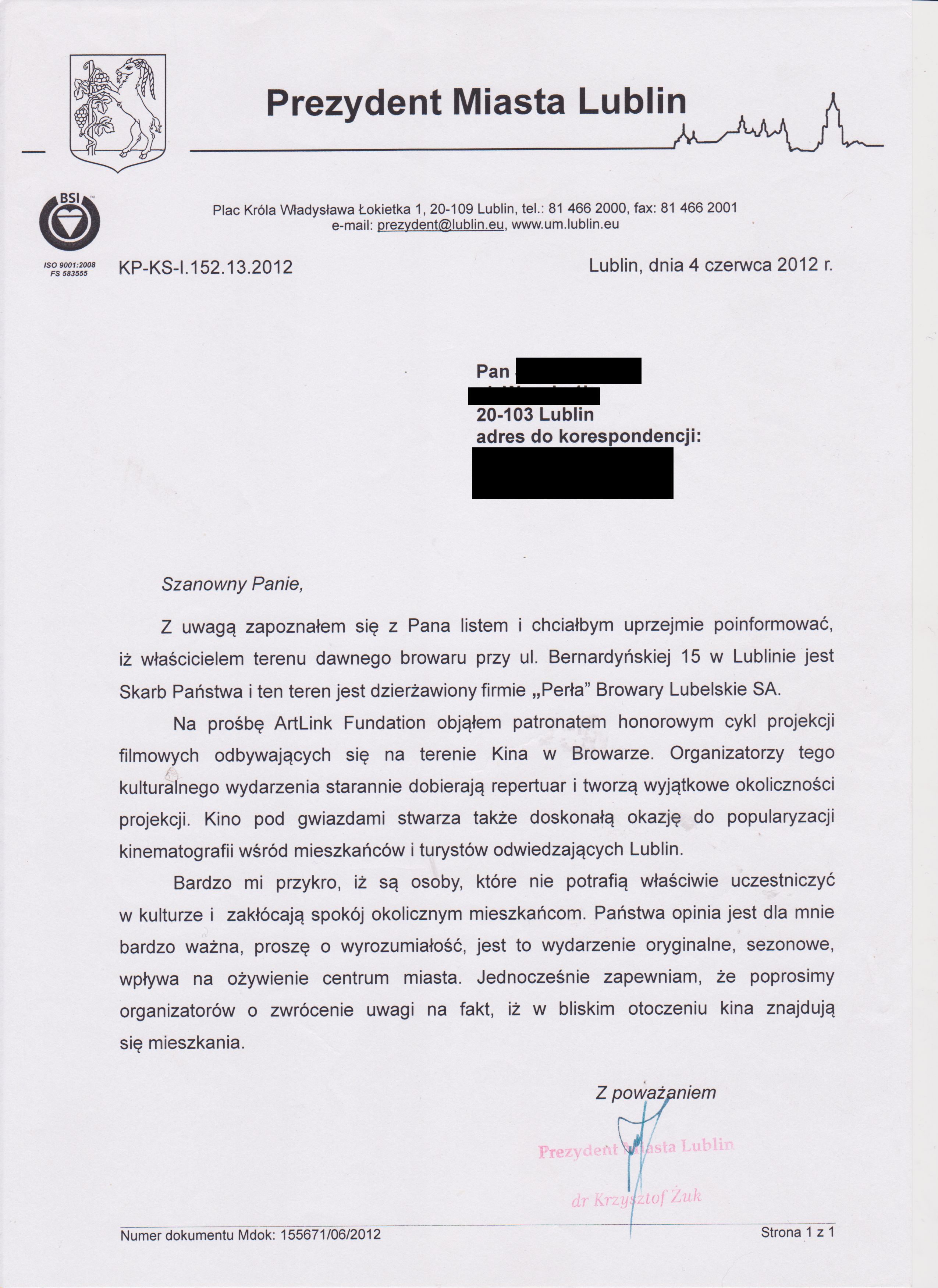1) jak Pan Prezydent, być może, zdążył się do tej pory zorientować, dom, w którym zamieszkuję ja – i moja rodzina, zlokalizowany przy ulicy Wesołej 1b, znajduje się w bezpośredniej bliskości, jak to Pan Prezydent raczył zauważyć – na łamach „Dziennika Lubelskiego” – nowej przestrzeni, wykreowanej przez Browary, możliwej do wykorzystania, w celu imprez kulturalnych urządzania. Od mojego domu do granicy „przestrzeni wykreowanej” jest niespełna 30 metrów (przez grzeczność pomijam już to, że Pan Prezydent został najprawdopodobniej przez kogoś wprowadzony w błąd: przestrzeń, której zasługę wykreowania przypisano obecnie Browarom, znajduje się tutaj – czyli jest wykreowana – niezmiennie od lat co najmniej kilkudziesięciu). Zatem nie będzie przesadą stwierdzenie, że dom mój został obecnie, przez Pana Prezydenta, umieszczony w „przestrzeni wykreowanej” i posadowiony praktycznie na placu koncertowym. A to z kolei oznacza, że ja – i moja rodzina – zostaliśmy przez Pana Prezydenta na ów koncert zaproszeni: oczywiście, za powyższe zaproszenie, bardzo uprzejmie Panu Prezydentowi dziękujemy, zwracając jednocześnie – i równie uprzejmie – uwagę Pana Prezydenta na to, że zaproszenie wtedy tylko nazywane może być zaproszeniem, gdy zapraszający daje zapraszanemu wolność wyboru, zakładając możliwość jego odrzucenia;