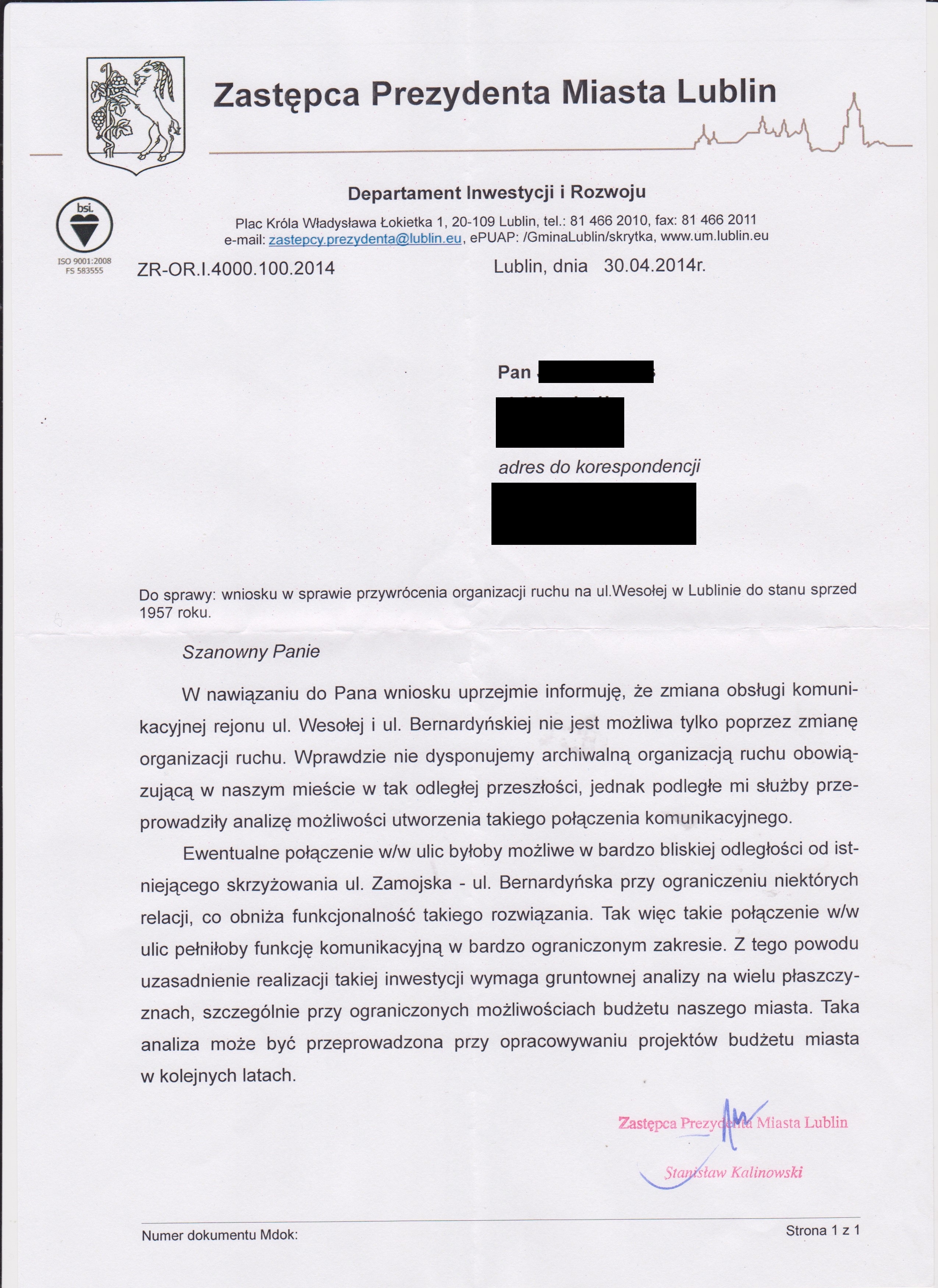 …ustami Pana Prezydenta Stanisława Kalinowskiego na pytania w sprawie ulicy Wesołej skierowane do Pana Prezydenta Krzysztofa Żuka, dnia 7 czerwca 2011 r.: