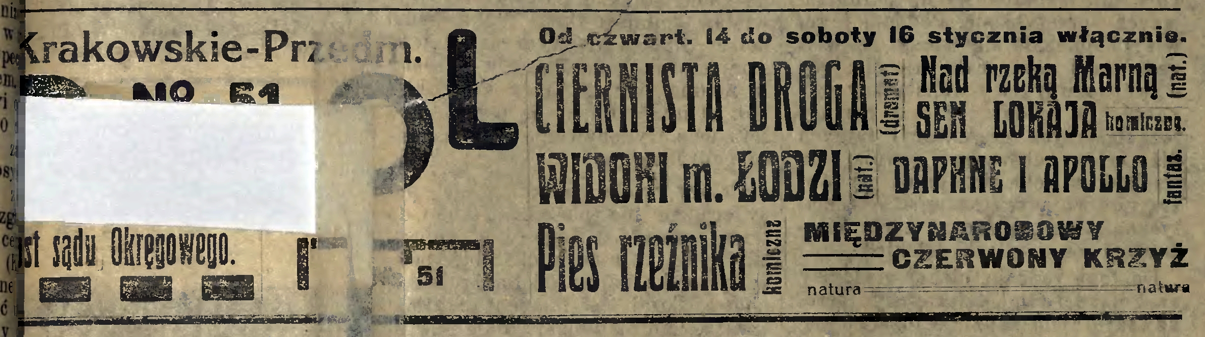 (r) Z „Bristolu”. Od czwartku b. m. do soboty 16 b. m. włącznie demonstrowany będzie nowy program złożony z nast. obrazów: Ciernista droga (wspaniały dramat), Nad rzeką Marna (nat.), Sen lokaja (komiczne), Widoki m. Łodzi (nat.), Daphne i Apollo (fantazja), Pies rzeźnika (komiczne), Międzynarodowy Czerwony Krzyż (natura).