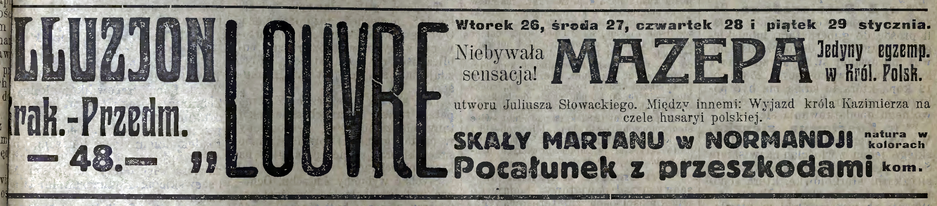 Z „Louvru”. W bioskopie „Louvre” już tylko dziś i jutro będzie demonstrowany dramat „Mazepa” według poematu Juliusza Słowackiego. Obraz ten zasługuje ze wszech miar na zobaczenie. Pan Kubicki, właściciel „Louvru” nie licząc się z ogromnemi kosztami, jakie pociągnęło za soboą sprowadzenie tego arcydzieła kinematograficznego dał nam możność podziwiania na ekranie jedną z pereł naszej literatury dramatycznej. Całość przestawia się imponująco i robi na widzu wrażenie, a i techniczna strona obrazu nic nie pozostawia do życzenia: niema tak pospolitych drgań, a odznacza się nadzwyczajną jasnością i plastyką.