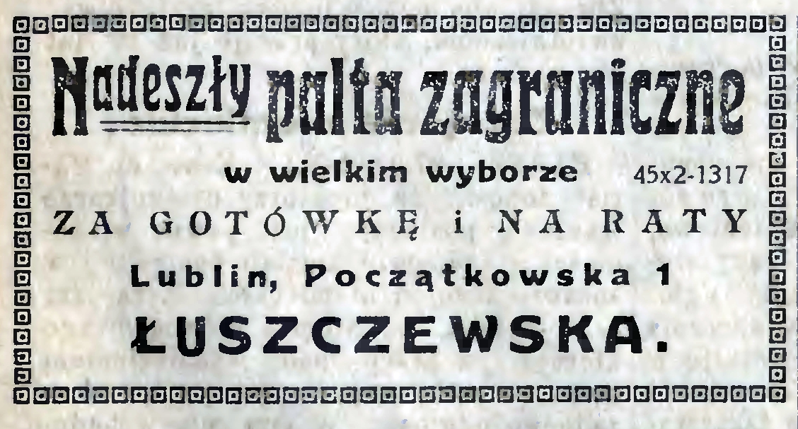 Zaśmiecanie ulic może wreszcie ustanie. (.w) Ulice naszego miasta jak dotychczas przedstawiają obraz nędzy i rozpaczy. Każdy przechodzień nie licząć się z niczym i z nikim rozrzuca po chodnikach świstki papieru, a są i tacy, którzy dla większego uprzyjemnienia sobie spaceru po ulicy żują najprzerozmaitsze ziarka i pestki, odpadki których pokrywają całe niemal chodniki. Ażeby zapobiedz temu i przyczynić się do estetyczniejszego wyglądu naszych ulic, podobno Magistrat lubelski zwrócił się już do komendy miejscowej policji o wydanie podwładnym funkcjonariuszom odpowiednich zarządzeń. Witając z uznaniem troskę Magistratu o wygląd ulic naszych, wyrażamy niepłonną nadzieję, że policja lubelska przychylając się do prośby Magistratu uczyni wszystko co jest w jej mocy, by zapobiec dalszemu zanieczyszczeniu ulic i skwerów. Warto również, by służba w ogrodzie miejskim zastosowując się do wskazówek Magistratu szczególną uwagę zwróciła na publiczność parkową niszczącą w ten sam sposób wszystko co godnem uwagi jest w naszym jedynym miejscu spacerowym.
