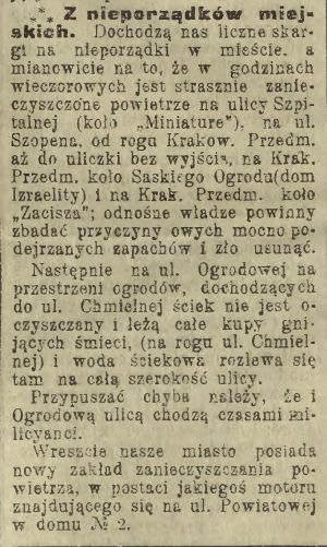 Przy ulicy Powiatowej w domu Nr 2 pojawił się nowy zakład zanieczyszczania powietrza, w postaci jakiegoś motoru. Z parterowej budy drewnianej, w której się mieścił motor rozchodził się w godzinach wieczorowych gęsty, gryzący dym, który niczym iperyt zasnuwał całą przestrzeń ul. Powiatowej, Ogrodowej, skwer przed kościołem garnizonowym i na przylegającej części Krak. Przedm. Dym się nie rozwiewał, bo wokół stały wysokie kamienice.