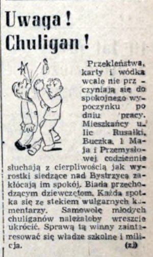 Jak czytamy w „Kurierze”, problemem porozrzucanych płyt chodnikowych mogliby się zająć miejscowi chuligani. Niestety ci zajęci byli zupełnie inną działalnością, prowadzoną tradycyjnie w rejonie ulic Rusałki, Buczka (obecnie Zamojska), Przemysłowej i 1-go Maja (obecnie Fabryczna). Dziś tamtych chuliganów już nie ma, możecie się jednak spotkać z ich wnukami. Adres już znacie: