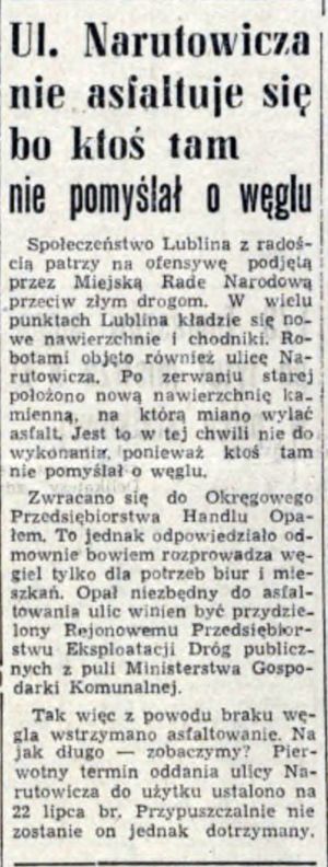 Również ulica Narutowicza nie miała tyle szczęścia, by leżeć „naprzeciw Ratusza” – mało tego, znajdowała się również z dala od… Okręgowego Przedsiębiorstwa Handlu Opałem. A cóż wspólnego ma asfaltowanie ulicy z opałem? – zapytacie. Ano ma. Wybaczcie, ze nie będę się zagłębiał w szczegóły techniczne procesu asfaltowania, ale węgiel był do tego niezbędny. Niestety Rejonowe Przedsiębiorstwo Eksploatacji Dróg Publicznych przydziału węgla nie otrzymało, w związku z czym asfaltować Narutowicza nie było sposobu. I w ten oto sposób załamała się „ofensywa podjęta przez Miejska Radę Narodową przeciw złym drogom”. Od tamtych czasów minęło sześć dekad… czyżby obecnie Pan Prezydent też nie miał węgla?