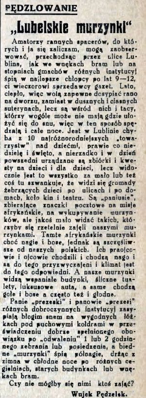 Lipcowe noce gorące i duszne… można nawet spać pod gołym niebem. Albo i nawet w bramie kamienicy… Tak właśnie czyniły lubelskie murzynki (dziś niektórzy powiedzieliby murzyniątka), czyli chłopcy po lat 9-12, ci wieczorowi sprzedawcy gazet. Niektórzy z nich mieli nawet własne „domy”, lecz – mimo to – woleli wypoczynek na dworzu, niż w dusznych i ciasnych suterynach. Ale wielu nie miało nawet dachu nad głową. I wszystko to działo się w mieście szczycącym się 10 najróżnorodniejszymi towarzystwami [opieki] nad dziećmi! Które to towarzystwa, raz po raz, organizowały zbiórki na misje afrykańskie i wykupywanie murzynków. Nie ma oczywiście niczego złego w pomocy wszystkim potrzebującym, ale tylko wówczas, jeśli nie sprowadzają się do tego, że panie „prezeski” i panowie „prezesi” różnych dobroczynnych instytucyj zasypiają błogim snem na wygodnych łóżkach pod puchowymi kołdrami w przeświadczeniu dobrze spełnionego obowiązku po „odwaleniu” 1 lub 2 godzinnego zebrania lub posiedzenia, a biedne „murzynki” śpią półnagie, drżąc z zimna w chłodne noce po różnych cegielniach, starych budynkach lub wnękach bram”.