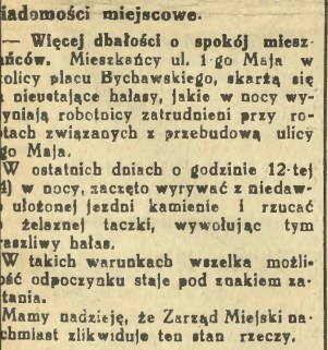 Na niepokojące hałasy skarżyli się na łamach „Głosu” mieszkańcy ulicy 1-go Maja z okolic Placu Bychawskiego. Jak się okazało, hałasy wyczyniali w nocy robotnicy zatrudnieni przy robotach związanych z przebudową ulicy 1-go Maja.