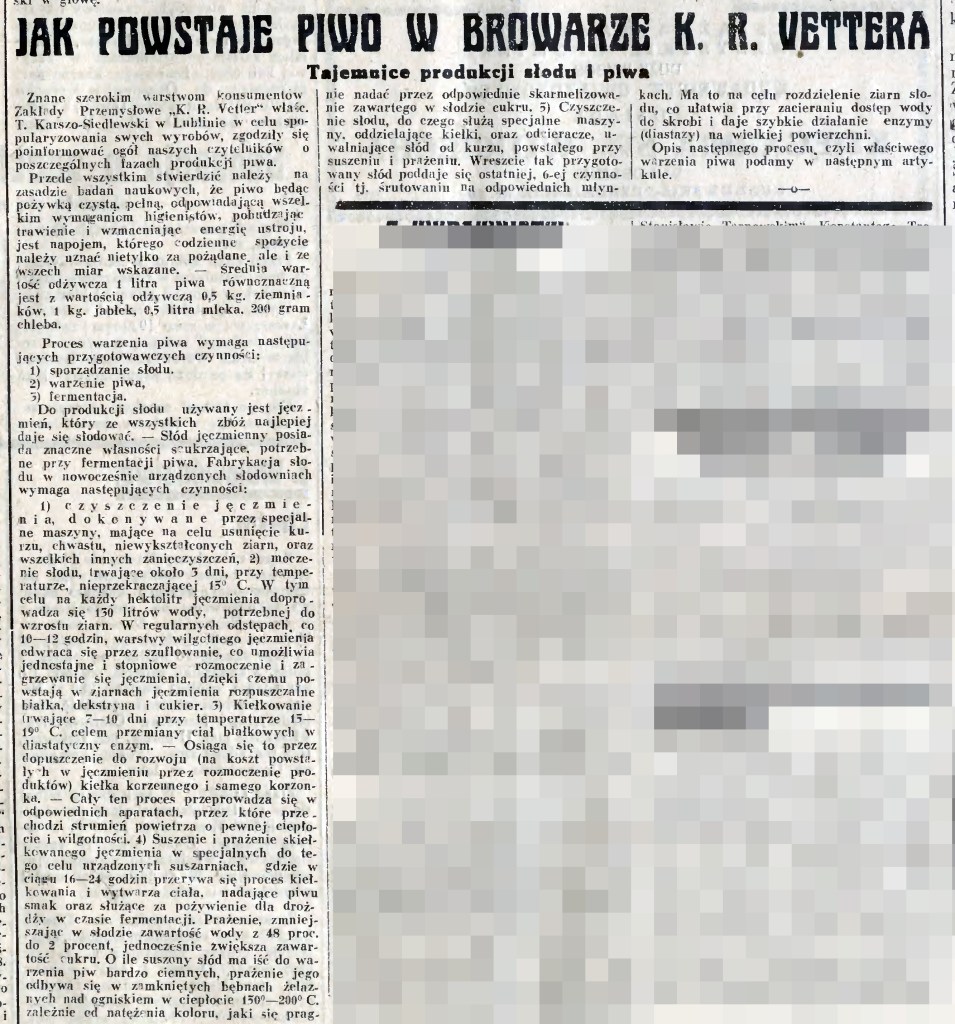 Okres przedświąteczny, to tradycyjny czas nacechowany czasu brakiem właśnie. Tak jest teraz (O Borze! – to taki las…), tak było i przed osiemdziesięciu laty w Lublinie. Po prostu nie ma czasu na nic, tylko czasem jest chwila czasu, by pomyśleć, że znów nie ma czasu. Nie ma czasu na pisanie, nie ma czasu na czytanie, a tym bardziej czytanie o tym, jak powstaje piwo w browarze K. R. Vettera (tak, proszę sobie wyobrazić, ze w browarze K. R. Vettera powstawało piwo! Bo w browarze, co jest teraz…) Ale jeśli ktoś ma takie pragnienie (nie na piwo, lecz lekturę o nim) zapraszam do „Głosu Lubelskiego” z 23 grudnia 1937 r. (czyli wigilii Wigilii):
