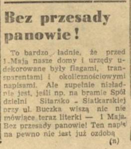 Jednak nie po raz pierwszy radość Redakcji okazała się mocno przedwczesna. Bo – tak jak widzimy poniżej – może i pstrokate afisze miały zniknąć z murów, ale nikomu nie przyszło do głowy, że ich miejsce zajmą, nie mniej pstrokate napisy i rysunki, będące wyrazem, nie artystycznego smaku, lecz kultury braku…
