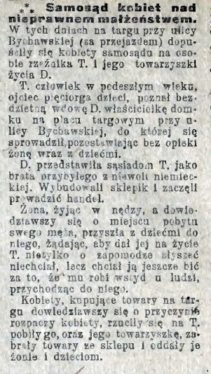 T. – jak wyjaśnia gazeta – był człowiekiem w podeszłym już wieku, ojcem pięciorga dzieci, który poznał bezdzietną wdowę D. właścicielkę domku na placu targowym przy ulicy Bychawskiej. Nie wiadomo czy niezwykła uroda rzeczonej D., czy może jednak fakt posiadania przez nią domku na placu targowym (bo może T. szukał zbytu dla swych kiełbas i szynek?), skłoniły rzeźnika do wspólnego z nią zamieszkania. Nie byłoby w tym nic zdrożnego, gdyby nie to, że tym samym T. pozostawił bez opieki żonę wraz z dziećmi! Chociaż być może kierował się całkiem logicznymi przesłankami (w osiem osób (D., T., jego Żona i pięć małych Teciątek) trudno się jest pomieścić w niewielkiej zapewne budce targowe), nie spotkał się jego wybór ze społeczną akceptacją, oj nie! Ale o tym za chwilę – najpierw, kolejne fakty: wkrótce potem T. i D. wybudowali mały sklepik (ha! czyli domek jednak za mały!) i razem zaczęli prowadzić handel. D(ama) – chcąc zapewne uniknąć sensacji i plotek – przedstawiła sąsiadom T. jako brata przybyłego z niewoli niemieckiej.