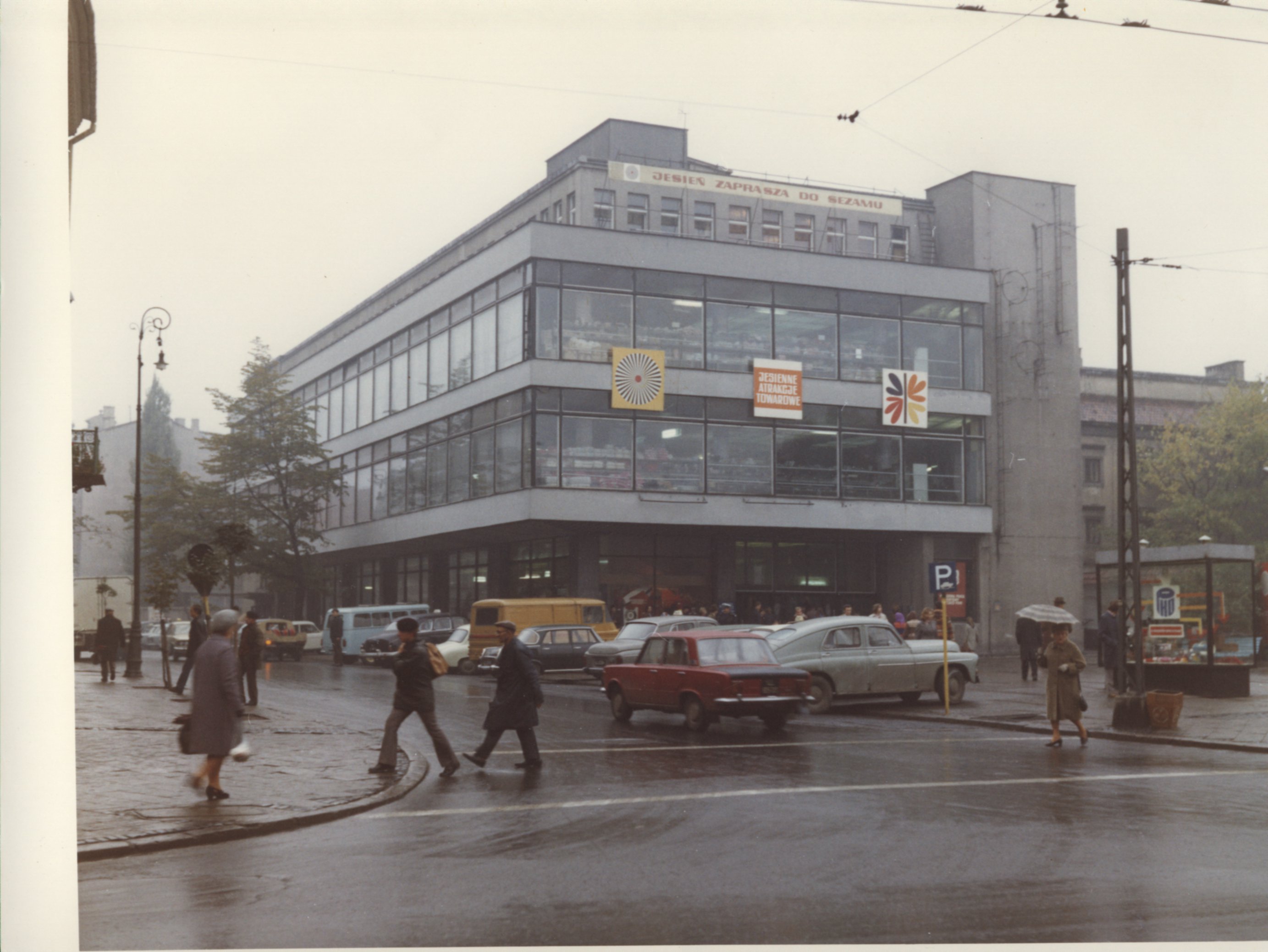 Fotografie z roku 1975, którymi posłużymy się dodatkowo, uchwyciły ten czas w kolorze: widzimy zatem (1667/III) że z zewnątrz „pedet” (PDT – Państwowe Domy Towarowe) dziś wygląda prawie tak samo jak 36 lat temu. Drobne różnice w wyglądzie wynikają z kilku szczegółów: w roku 1975 nie było zasłaniających fronton budynku banerów reklamowych, na zewnątrz parkowały cuda ówczesnej motoryzacji: samochody marki „Warszawa” (w tym jeden „garbus”), „Syrena”, „Nysa” i „Żuk”. Ulicą przejeżdżał duży fiat. Spoglądając na „Sezam”, w ten dzień deszczowy (pani przechodząca przez Kapucyńską skryła się pod parasolem) i jesienny („Jesień zaprasza do Sezamu” i „Jesienne atrakcje towarowe”), możemy ulec nierozerwalnie związanej z tą porą roku melancholii – aby temu zapobiec pooglądajmy wystawy.