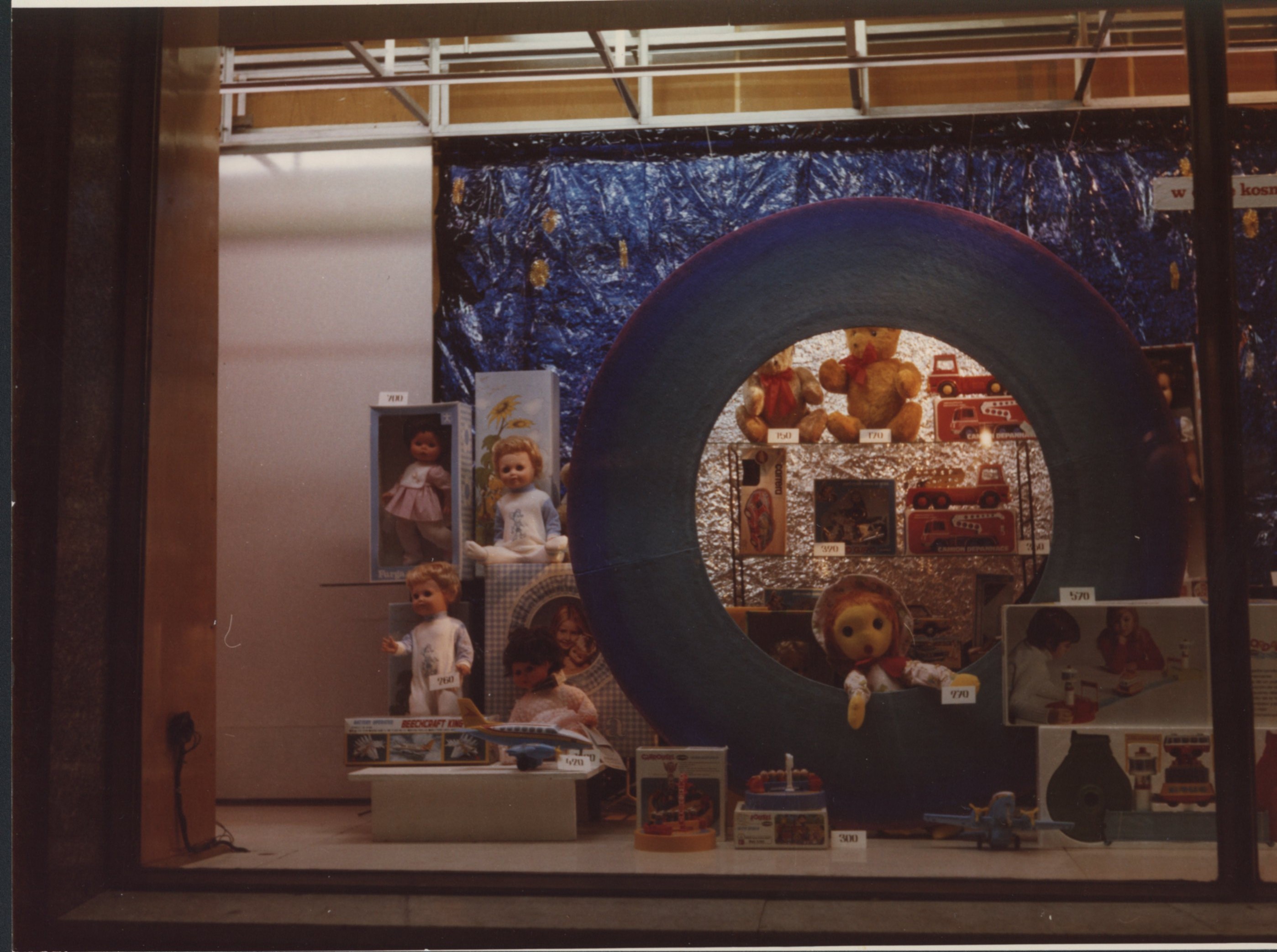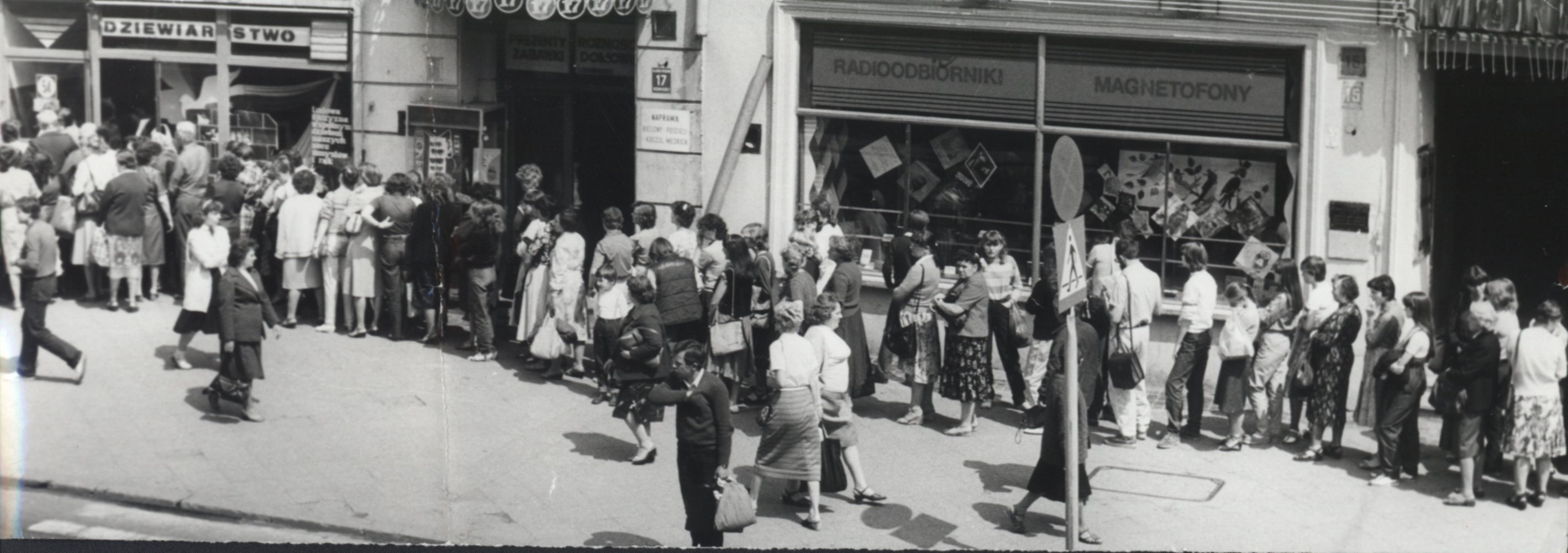 Puste półki coraz częściej pokrywały się kurzem, a towary okazyjnie „rzucano” do sklepów, tak że kupienie czegokolwiek zaczęło graniczyć z cudem. Jednak na pomoc sił nadprzyrodzonych przeważnie nie było co liczyć, tak więc ludzie zmuszeni zostali do wystawania przed sklepami – często całymi rodzinami – w nadziei, że akurat coś rzucą: niekoniecznie pralkę czy telewizor, może herbatę lub cukier, albo i papier toaletowy. I tak pod sklepy wróciły kolejki. Na kolejnej, tym razem już czarnobiałej fotografii (2665/II), widzimy taką malowniczą kolejkę, najprawdopodobniej do dziewiarstwa na Krakowskim Przedmieściu. Oczekiwanie na wystaną w kolejce nagrodę umilano sobie na różne sposoby: jedni czytali prasę lub książki, inni wpatrywali się w witryny mijanych po drodze sklepów. Pozostali – z determinacją lub rezygnacją – po prostu stali. Na fotografii znalazł się również sklep „17” – popularna „siedemnastka”, w której sprzedawano plastikowe żołnierzyki w skali 1:75 oraz inne drobiazgi, to jest „upominki”). Ale nie tylko konieczność „wystawania” wszystkiego w kolejkach była zmorą lat 80-tych – większość produktów była reglamentowana. Prawie na wszystko więc potrzebne były kartki.